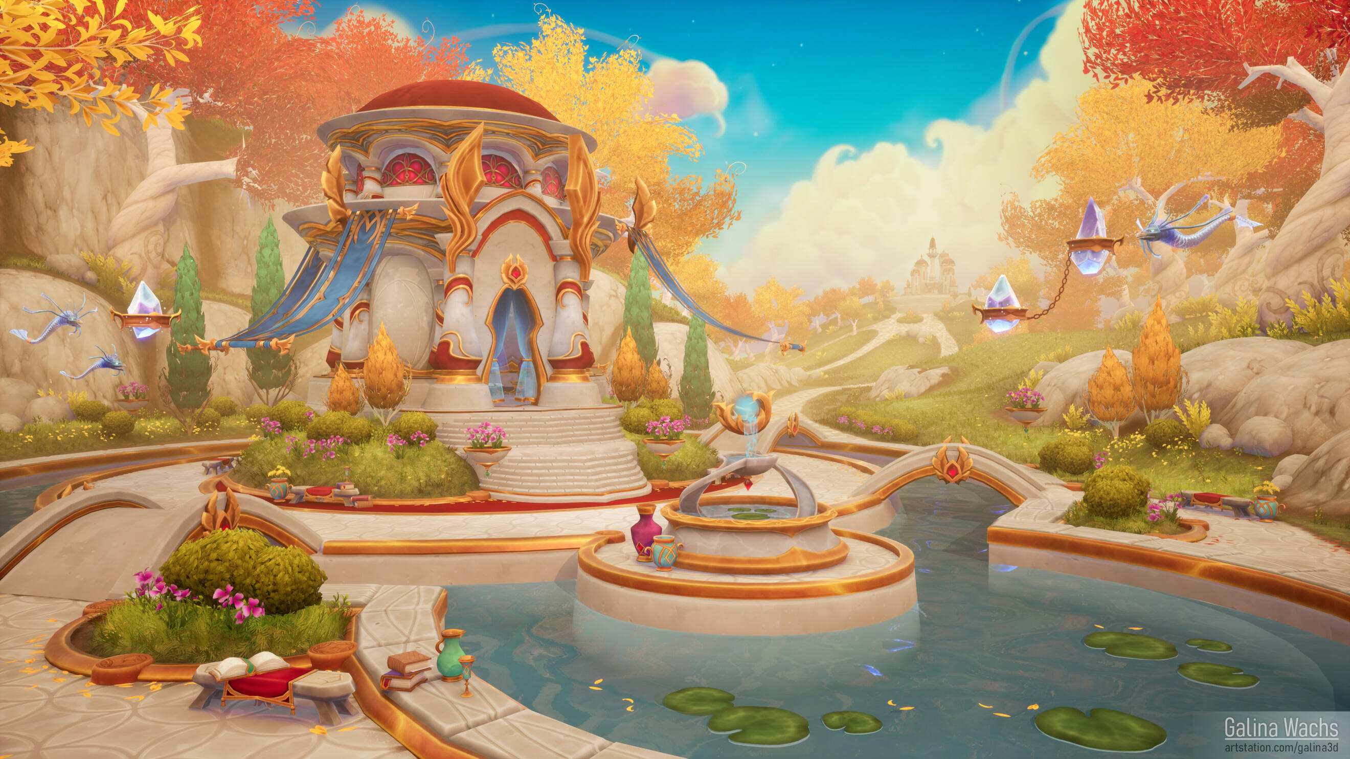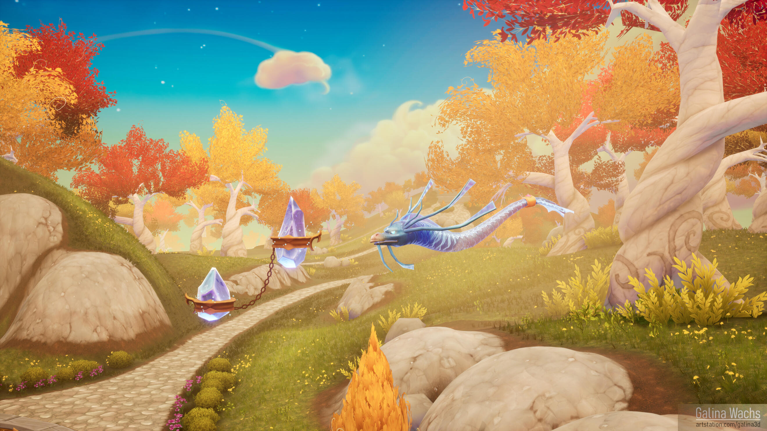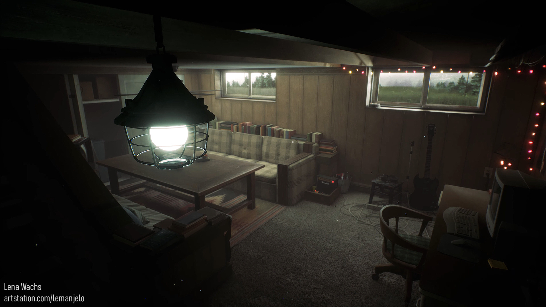 Hi! My name is Galina, but I go by Lena. I'm an environment artist who's passionate about creating atmospheric, story-driven spaces. Outside of work, I love playing piano, climbing, playing tabletop games, and indulging my dog Mila who runs the show.